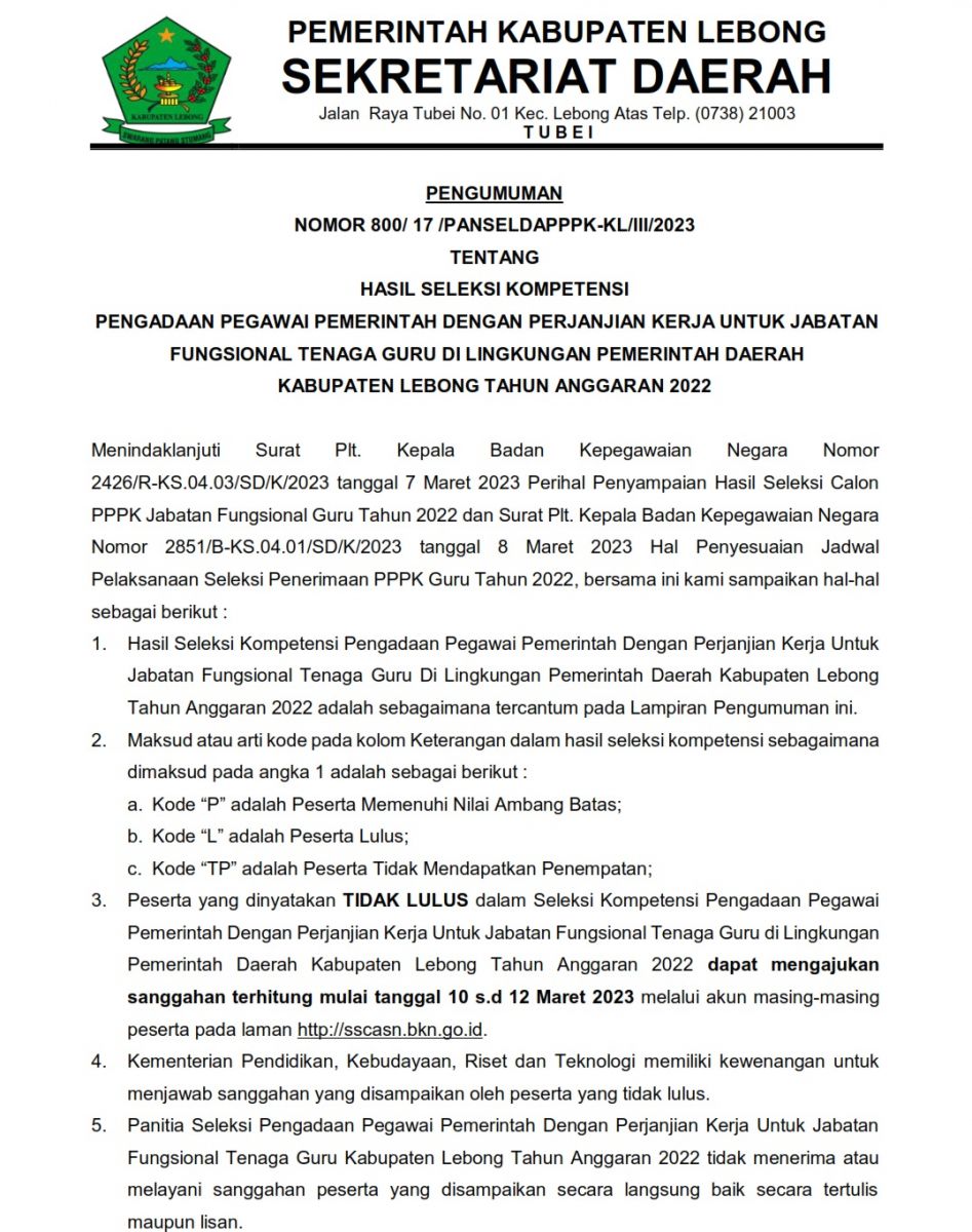 HASIL SELEKSI KOMPETENSI PENGADAAN PEGAWAI PEMERINTAH DENGAN PERJANJIAN KERJA UNTUK JABATAN FUNGSIONAL TENAGA GURU,