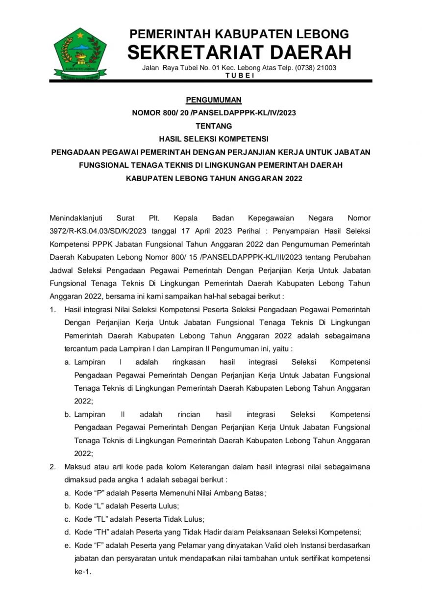HASIL SELEKSI KOMPETENSI PENGADAAN PPPK UNTUK JABATAN FUNGSIONAL TENAGA TEKNIS DI LINGKUNGAN PEMERINTAH DAERAH